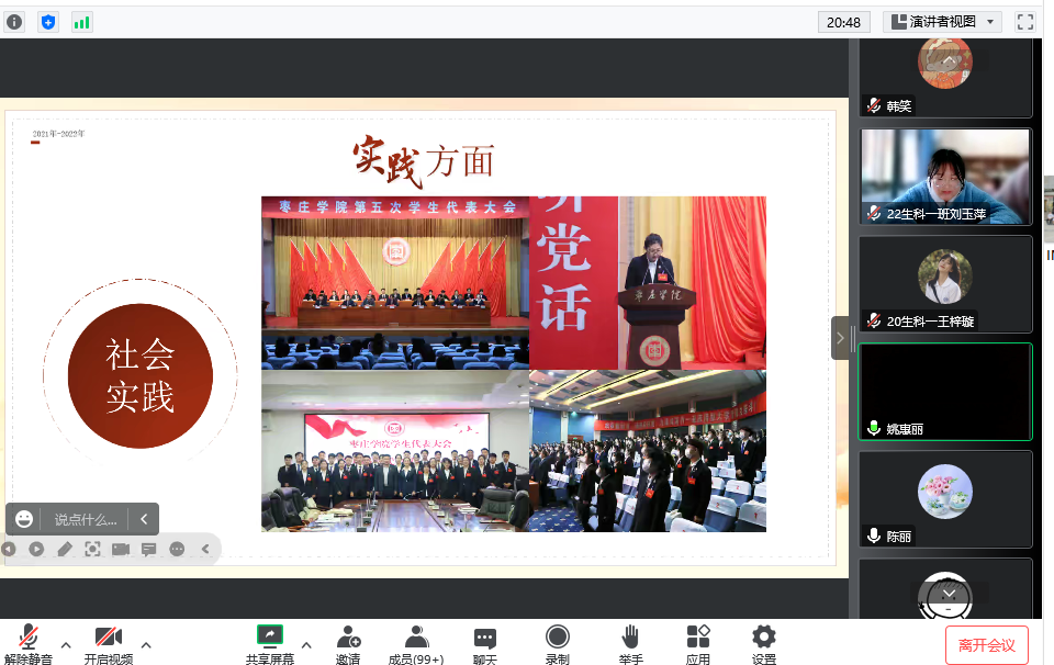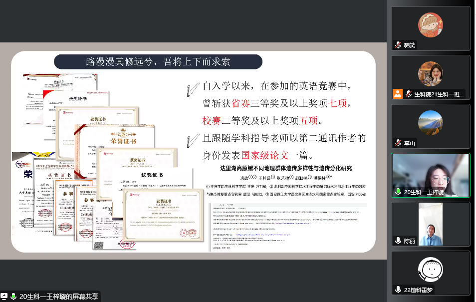 2022年国家奖学奖、省政府奖学奖、校长奖学金、“卓越之星”奖学金获得者姚惠丽、刘雯清、庄乾敏、韩紫硕、祖爱华、王梓璇六位同学分别从学习科研、英语学习、考研复习、社会实践、职业生涯规划等方面向大家汇报自己的成绩和体会,勉励同学们要积极探索、勇于尝试,在不断实践中找到适合自己的人生方向。