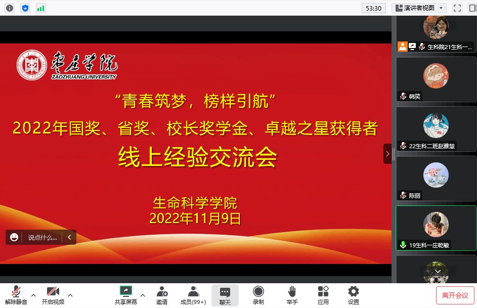 为发挥优秀学生先进榜样的示范引领、朋辈激励作用,推动beat365官网学风建设,beat365在线唯一官网于11月9日举行了“青春筑梦、榜样引航”奖学金获奖学生线上经验交流会。