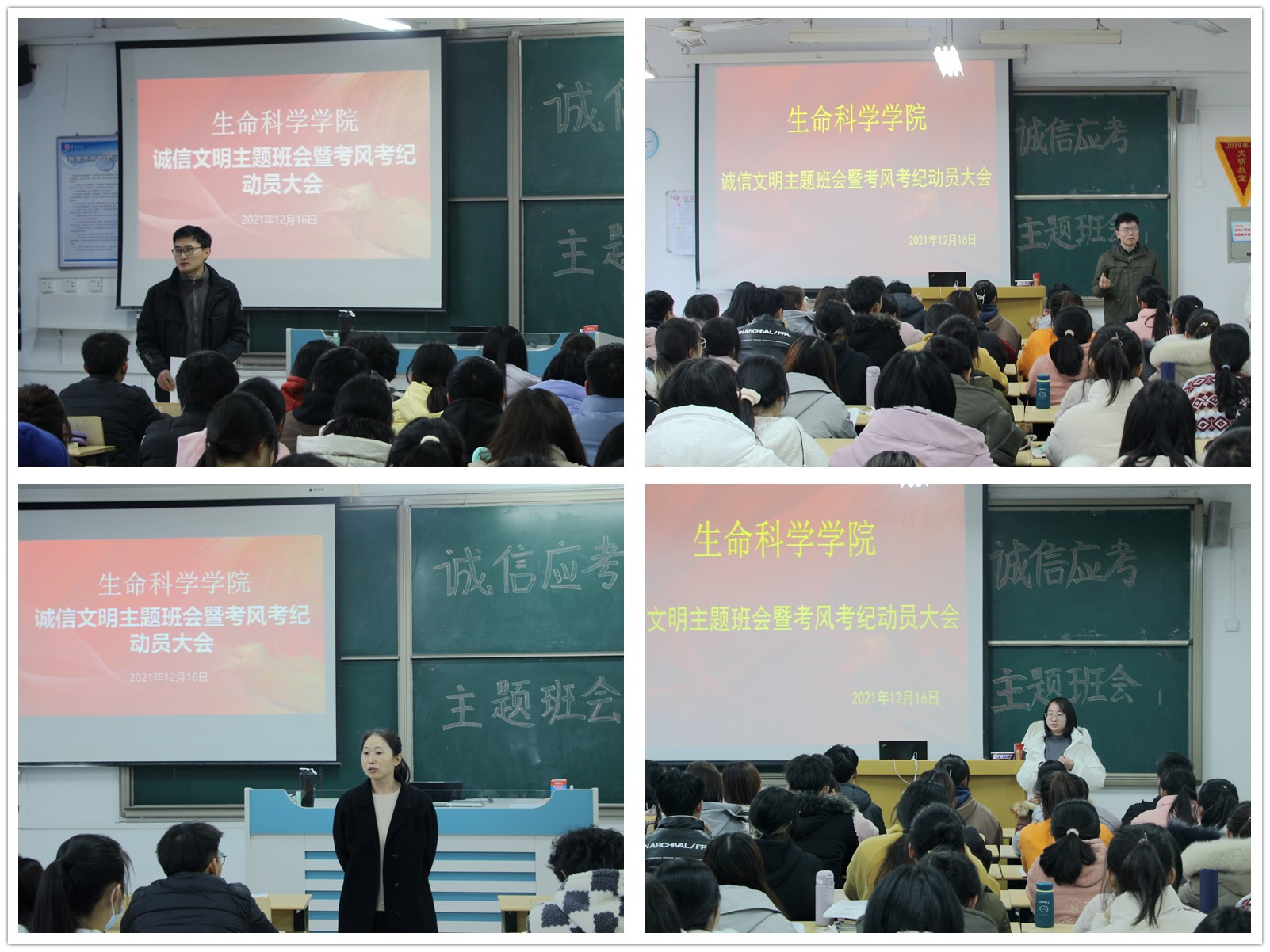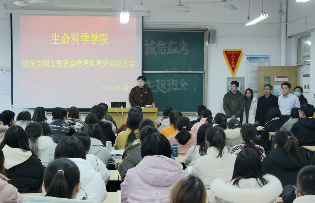 期末将近,为全面贯彻落实学校有关考试的要求,端正考试风气,严肃考试纪律,更好的推动学风建设发展,beat365在线唯一官网于12月15日-16日期间组织召开“诚信文明主题班会暨考风考纪动员大会”。各班辅导员、班主任主持会议,学院党总支书记郭传鑫带领党政领导班子走进学生课堂进行督导。