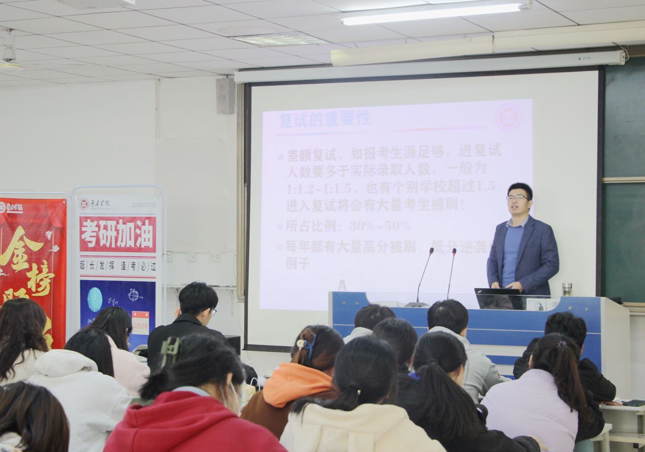 随后,院长助理申恒伦从复试的重要性、复试流程、备考思路、如何准备面试、如何联系导师、调剂流程及技巧等方面为同学们进行了专题辅导和答疑解惑。