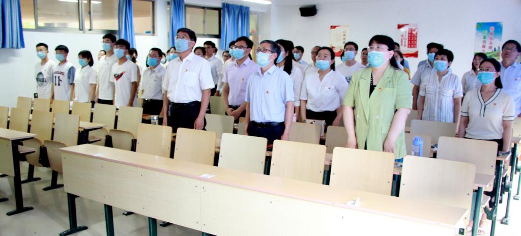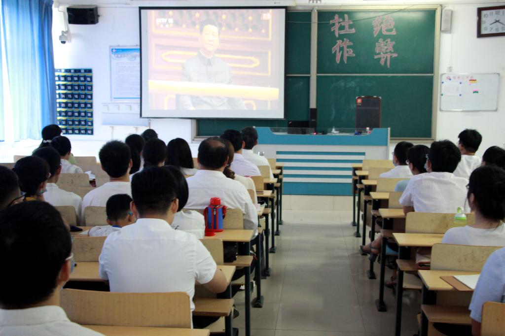 8时许,伴随100响礼炮响彻云霄,庆祝大会在天安门广场隆重开幕。全体党员起立,同唱国歌,向冉冉升起的五星红旗行注目礼。大家满怀激动的心情,全程认真收看了大会直播,仔细聆听了习近平总书记在庆祝大会上的重要讲话。现场,全体党员共同为党庆生的喜悦,以及身为一名中共党员、一名中国人的自豪感与荣誉感,化作了一波接一波的热烈掌声久久回响在教室内外。