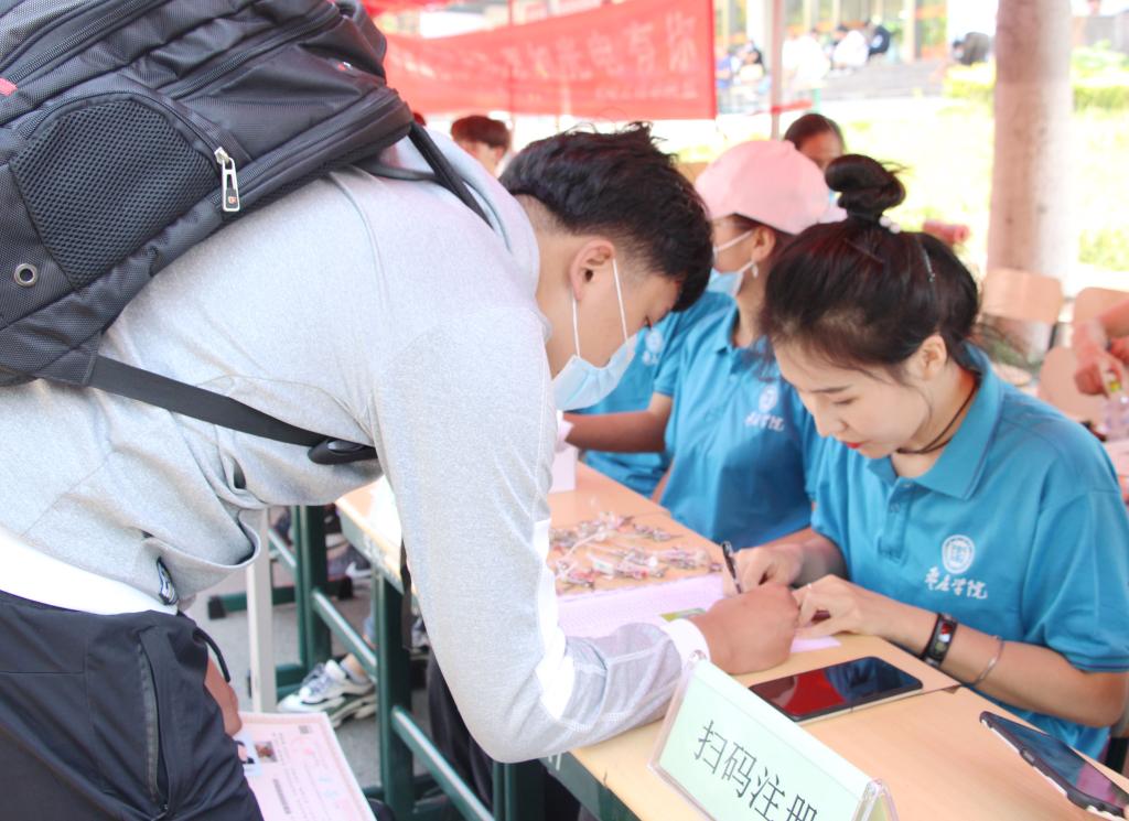 在学院迎新接待服务点,校党委副书记曾宪明十分关心新生的报到服务情况,认真听取学院迎新工作汇报。