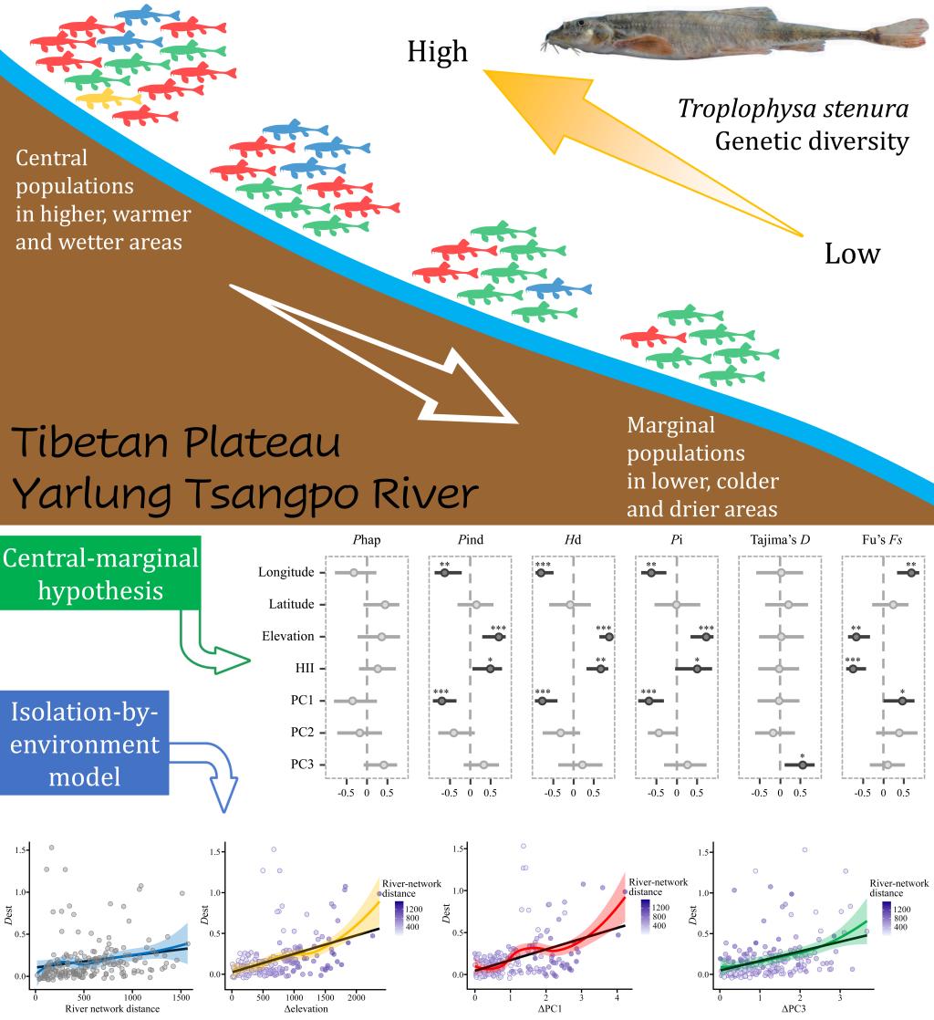 我校流域生态学团队巩政博士近年来联合中国科学院水生生物研究所、西藏自治区高原生物研究所、西藏自治区农牧科学院水产科学研究所等多家单位,在西藏最大河流—雅鲁藏布江流域开展了多次鱼类群落调查和样本采集工作,在此基础上利用线粒体基因分子标记对分布于该流域的两种典型高原鱼类(拉萨裸裂尻鱼Schizopygopsis younghusbandi和细尾高原鳅Triplophysa stenura)进行了景观遗传学解析。研究发现:两种高原鱼类在海拔更高、气温更低及降水更少的区域遗传多样性更高,作为起源于青藏高原腹地的物种,其遗传多样性格局符合中心-边缘假说(Central-marginal hypothesis)。两种鱼类的地理种群间普遍存在中高程度的遗传分化,海拔和气候梯度驱动遗传结构的产生,环境隔离模型(Isolation-by-environment model)可以更好地解释这种现象。此外,该项研究还揭示了雅鲁藏布江流域的鱼类群落结构,整合物种、功能及系统发育等多维度指数对该流域鱼类多样性进行了综合评价,解析了不同江段鱼类群落的构建机制。上述研究成果可为该流域水生生物多样性保护单元的划定、保护区的设立以及河流生态系统管理提供有力支撑。