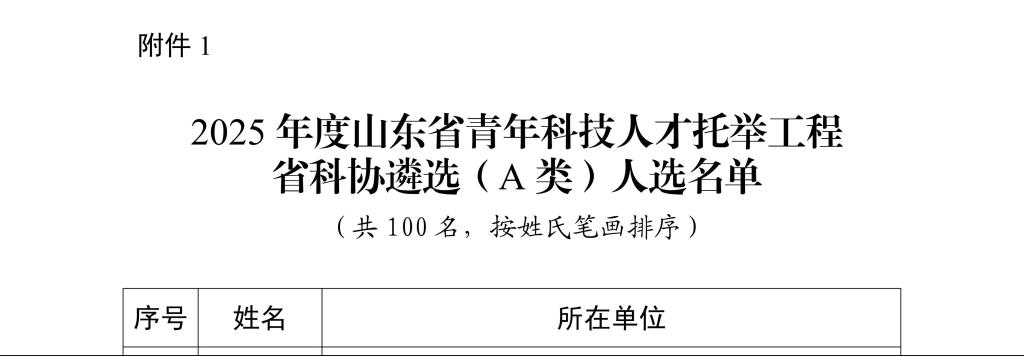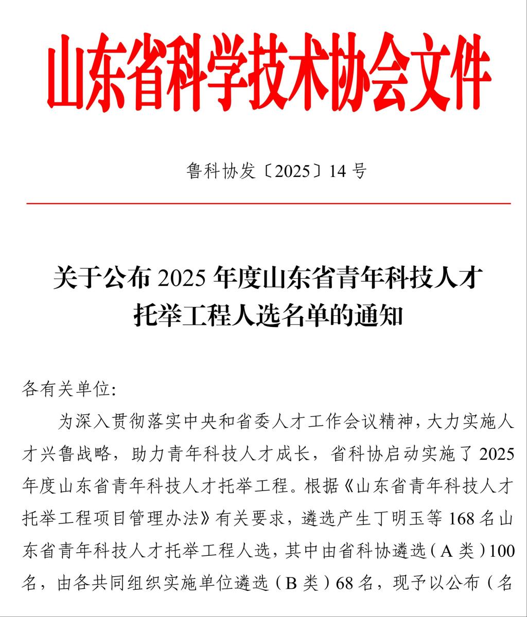 山东省青年科技人才托举工程是山东省科学技术协会为促进青年科技人才的成长、加强高层次科技创新后备人才队伍建设而实施的人才战略项目。旨在支持青年科技人在“科研黄金期”潜心研究、深入探索,激发创新热情和创造活力,寄望托举人才脱颖而出。托举工程每年遴选一批次被托举人,每批次实施周期为2年。通过前期推荐和评审,2025年度全省共有168人入选山东省青年科技人才托举工程,其中由省科协遴选(A类)100名,由各共同组织实施单位遴选(B类)68名。