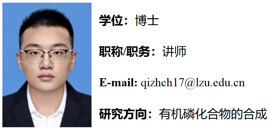 亓智超,男,中共党员。2023年6月毕业于兰州大学化学专业获得理学博士学位。同年加入兰州大学基础医学院博士后流动站开展博士后研究,于2025年11月出站。2026年1月进入beat365在线唯一官网工作,主要从事有机磷药物的相关研究。近年来在第一作者或者共同作者在《ACS Catal》、《Chem. Commun》、《J. Org. Chem》、《Chin. J. Org. Chem》等学术期刊上发表论文数篇。