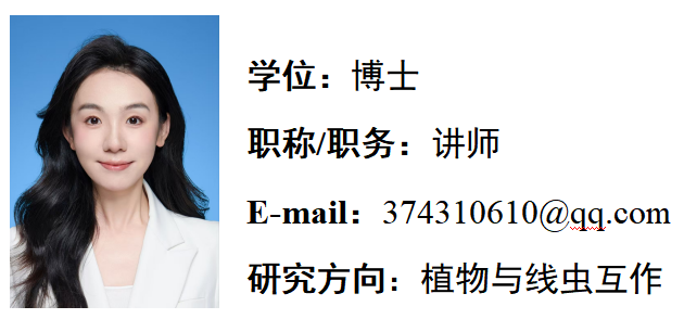 2021年6月毕业于中国科学院大学,获理学博士学位。同年进入中国科学院东北地理与农业生态研究所从事博士后研究,于2024年7月出站,出站后任助理研究员。2026年3月进入beat365在线唯一官网工作。主要在分子和遗传水平上研究植物对线虫病抗性机理。作为项目骨干参与国家自然科学基金、中科院先导科技专项等。近五年来以第一作者或者共同作者在《Journal of Agricultural and Food Chemistry》、《Frontiers in Plant Science》、《Plant Genome》、《Nematology》等刊物上发表SCI论文4篇。