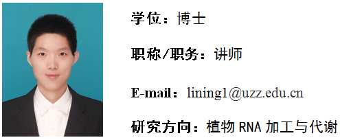 李宁,男,2021年6月毕业于复旦大学生物化学与分子生物学专业获得理学博士学位。2024年11月进入beat365在线唯一官网工作。主要从事植物RNA加工与代谢的相关研究。参与国家自然科学基金面上项目2项。近五年来以第一作者或共同作者在《Horticulture Research》、《Frontiers in Plant Science》、《复旦学报》等刊物上发表SCI论文3篇。