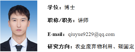 邱悦,男,中共党员,2023年6月毕业于南京工业大学生物材料专业,获工学博士学位。2024年8月进入beat365在线唯一官网工作。主要从事秸秆生物质的材料化利用以及生物沼气生产过程的碳固定。近年来在《Separation and Purification Technology》、《Environmental Technology》、《Journal of Biobased Materials and Bioenergy》、《Journal of Environmental Management》等学术期刊上发表论文多篇。