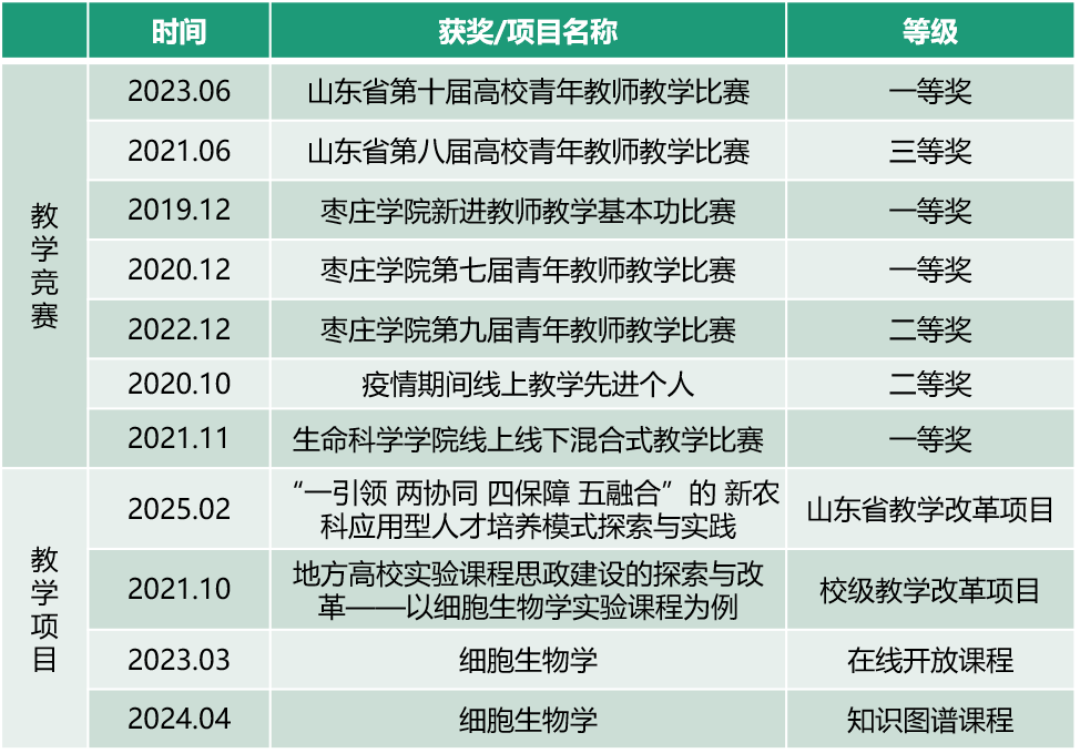 除了认真对待课堂教学,她还通过参加教学比赛和开展教学研究提升自身教学能力。7年来,她坚持走进老教师和优秀教师课堂听课,学习教学方法、教学设计、教姿教态。再通过参加教学比赛寻找自身不足,“以赛促教”不断提高教学水平。2019年获beat365在线唯一官网首届新进教师教学基本功比赛一等奖;2020年获beat365在线唯一官网第七届青年教师教学比赛一等奖,同年获得学校疫情期间线上教学先进个人二等奖;2021年,她代表学校参加山东省第八届高校青年教师教学比赛,但却遗憾的止步于复赛,获得三等奖;2023年,在积累沉淀一年后,她再次突围院赛和校赛,并代表学校参加山东省第十届高校青年教师教学比赛,这一次她没有再给自己留遗憾,从院赛到省级决赛共6轮比赛,历经冬、春、夏三季,历时近10个月,不断的打磨教学设计和教学课件,准备了近10万字的讲课稿,一遍遍地磨课、调整、改进,精雕细刻于每一个细节,最终,在各参赛阶段稳扎稳打,突破自我,用全力以赴的坚持,获得一等奖。此外,她积极开展教学研究,构建的“一引领 两协同 四保障 五融合”的新农科应用型人才培养模式获山东省教学改革研究项目立项,还主持完成校级教学改革项目1项,获批课程立项建设项目2项,发表教研论文2篇。