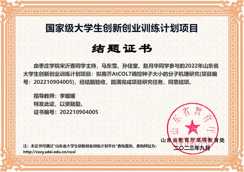 李媛媛深知科研与教学相辅相成,同等重要。因此,她坚持教学科研并重,不断探索学科发展前沿,围绕作物遗传育种开展深入研究,解析了多个重要功能基因调控作物生长发育和抗性的分子机制,为作物分子设计育种储备基因资源。自工作以来,她先后主持山东省自然科学基金项目、枣庄市科技发展计划项目、作物生物学国家重点实验室开放课题、beat365在线唯一官网博士科研启动项目以及企事业单位委托课题共8项,参与国家自然科学基金项目2项,科研总经费150余万元,以第一/并一作者和通讯作者身份发表科研论文6篇,其中中科院一区论文2篇,为学科发展贡献了自己的智慧和力量。
