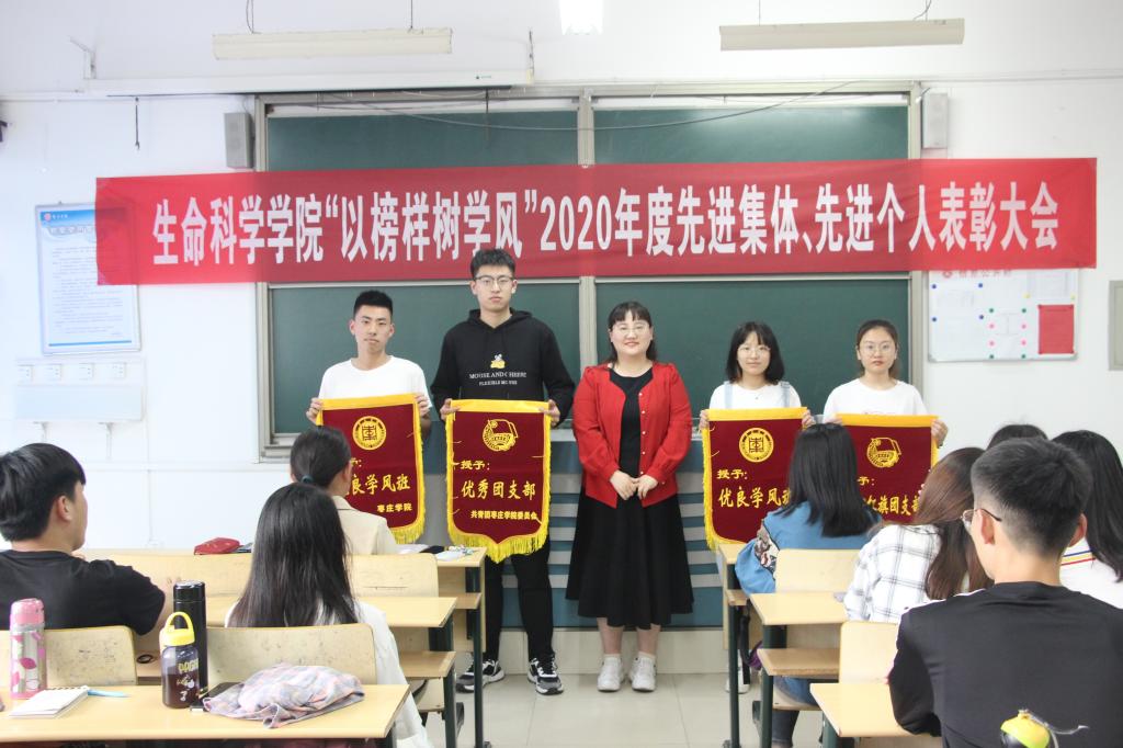 会上,陈丽老师宣读了表彰决定,与会领导和老师分别给2020年涌现的“十佳五四红旗团支部”、“优秀团支部”、“优良学风班”等4个先进集体、国家奖学金获得者刘彦进等7名先进个人代表颁发了锦旗和奖牌。集体代表、个人代表依次做了典型发言,他们表示一定珍惜荣誉,戒骄戒躁,争取更大的进步。党总支副书记韩笑对获奖集体和个人表示祝贺,并希望同学们继续保持认真的态度和奋斗的劲头,以建党100周年为契机,加强政治理论学习,努力在实践中淬炼过硬本领,做社会主义合格建设者和可靠接班人。