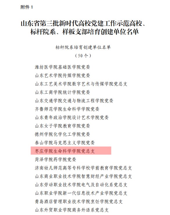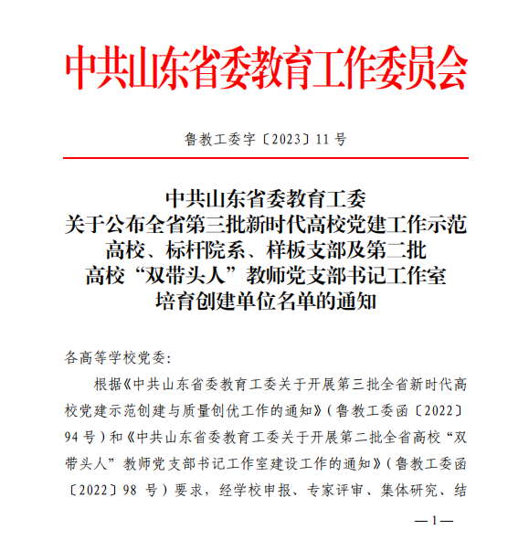 近日,中共山东省委教育工委发布《关于公布山东省第三批新时代高校党建工作示范高校、标杆院系、样板支部及第二批高校“双带头人”教师党支部书记工作室培育创建单位名单的通知》,beat365官网党总支获批“全省党建工作标杆院系”培育创建单位。