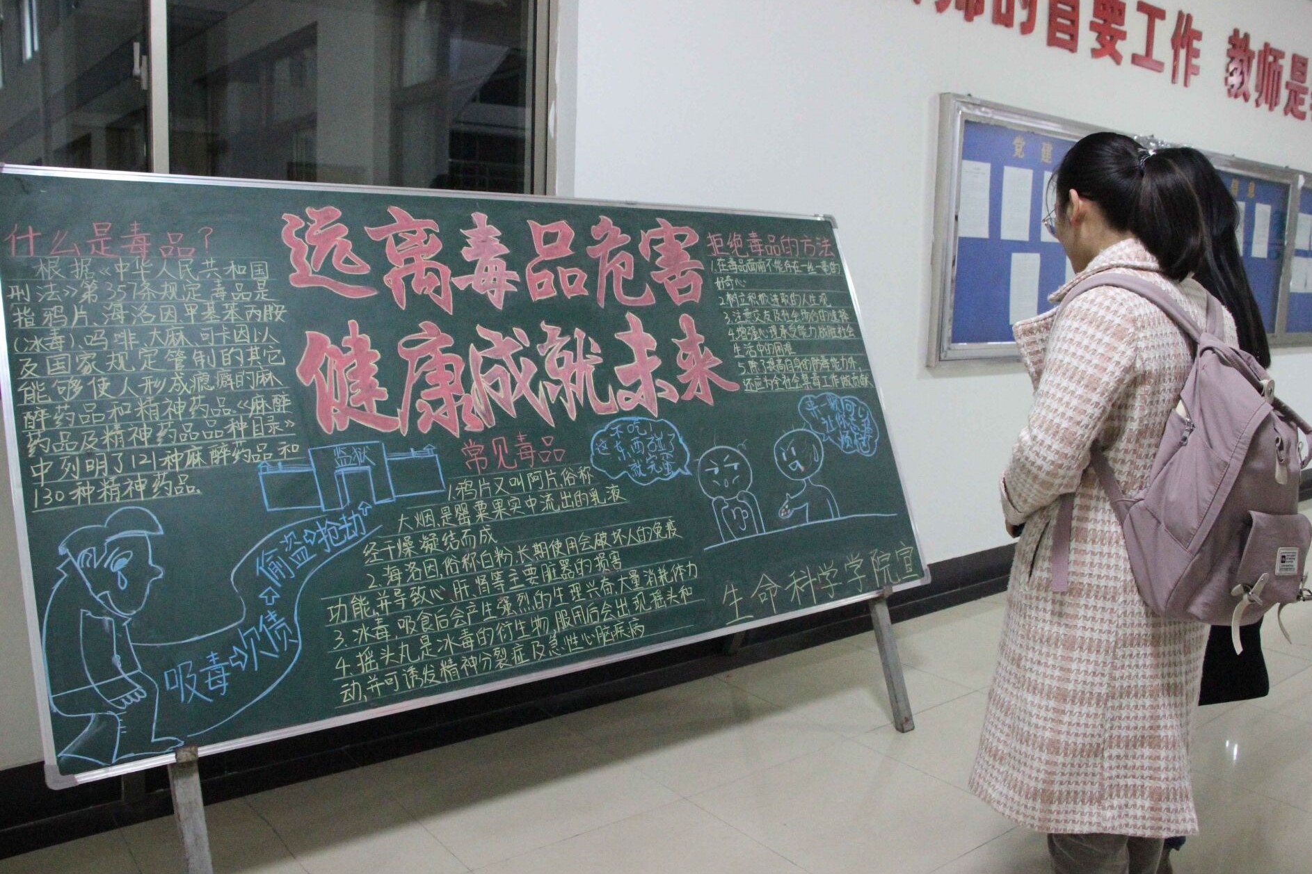 活动开展期间,学院通过线上的微信推出系列宣传禁毒知识,组织学生利用网上班课学习“珍爱生命,拒绝毒品”等禁毒知识,并组织测试,此外,绘制“远离毒品危害、健康成就未来”宣传展板,并以宿舍为单位开展禁毒相关书目的读书分享活动。通过系列宣传活动,让每个学生积极行动起来,并以“不让毒品进家”等形式,让禁毒知识宣传扩大到校外。