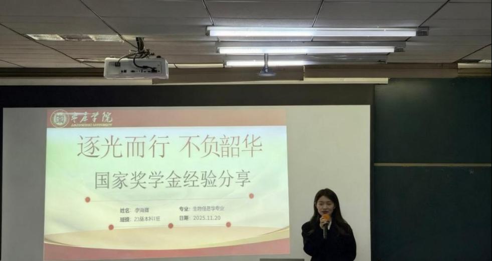 会上,国家奖学金获得者李海鹰、彭海洋,省政府奖学金获得者王雨彤依次登台发言。他们结合个人学业成绩、荣誉奖项、竞赛成果与社会实践等方面,生动讲述了各自的成长历程与奋斗故事。三位同学不仅展示了扎实的专业功底和出色的综合素养,更以真实感人的经历,诠释了坚持与努力的意义。现场气氛热烈,掌声不断,充分彰显了生科学子追求卓越、勇于拼搏的青春风采。