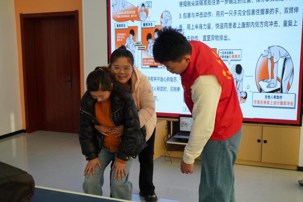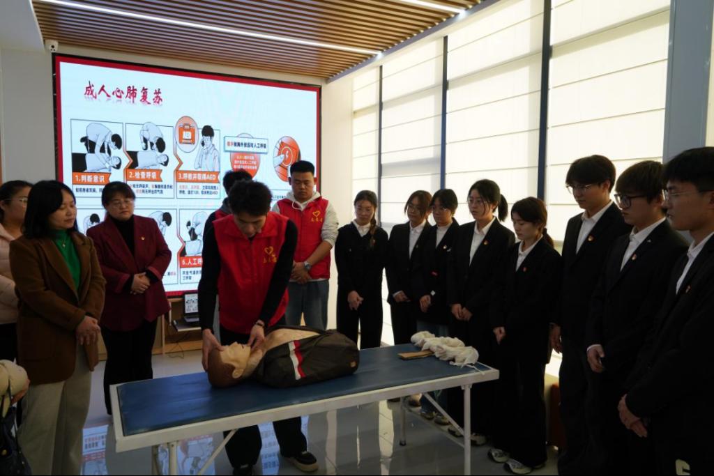 随后,“生命之光”青年志愿服务队为社区工作人员带来了一场实用而生动的急救知识技能培训。志愿服务队员结合生命科学专业背景,通过理论讲解、示范教学与模拟操作相结合的方式,系统讲解了心肺复苏(CPR)、自动体外除颤器(AED)使用、常见意外伤害应急处置等关键急救知识。培训过程中,社区工作人员认真聆听、积极互动,并在队员的耐心指导下进行了实操练习,现场学习氛围浓厚。