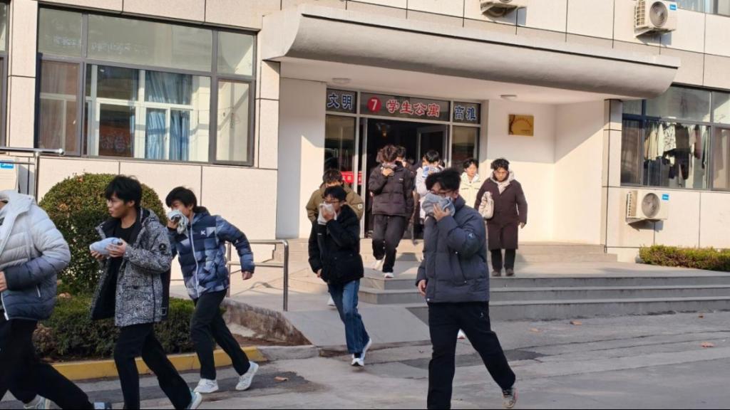 理论讲解结束后,实战演练环节有序推进。随着消防警报响起,疏散引导组迅速就位、分工协作,在楼道、楼梯口等关键位置有序引导学生撤离。全体参与人员沉着冷静,严格按照要求用浸湿毛巾捂住口鼻,弯腰低姿、沿楼梯扶手一侧快速有序地撤离至楼外指定安全区域。整个疏散过程紧张有序、衔接顺畅,全体人员均在规定时间内完成集合与人数清点,充分展现了良好的应急反应能力。