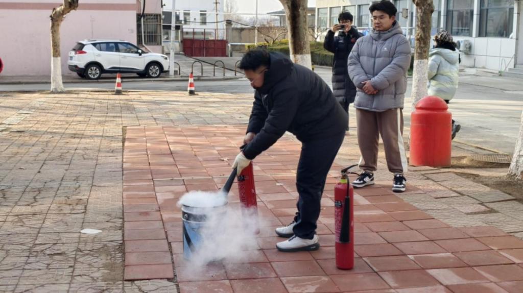 随后,师生们开展灭火器实操教学,演示了灭火器“一提、二拔、三握、四压”的标准使用流程。参与师生轮番上阵,亲手操作扑灭模拟火源,在沉浸式实战场景中切实掌握了初期火灾的科学扑救方法。